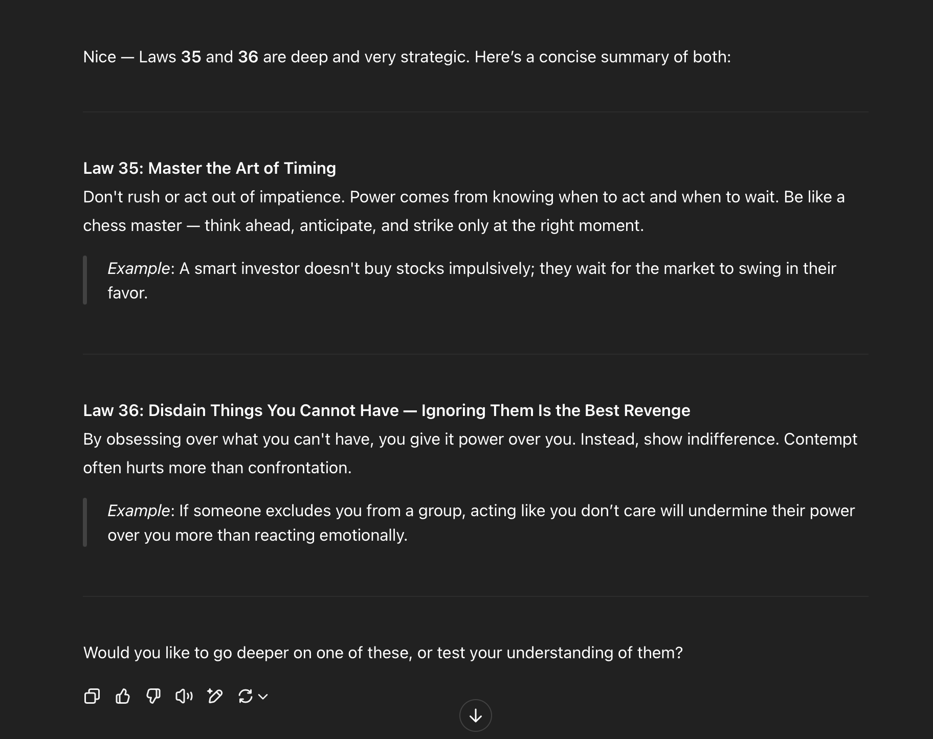 Look at what is says when I tell it that I finished reading laws 35 and 36 of the book “The 48 Laws of Power”.
